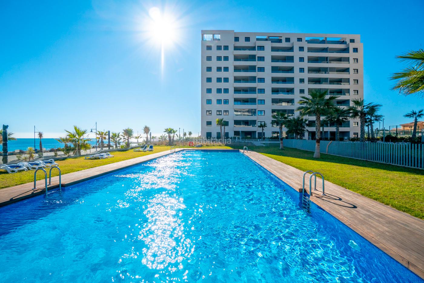 Este elegante apartamento de 2 dormitorios y 2 baños se encuentra en primera línea, ofreciendo impresionantes vistas abiertas al mar. Su diseño moderno y luminoso crea un ambiente acogedor y relajante, ideal tanto para vivir todo el año como para disfrutar de estancias vacacionales.El apartamento se vende completamente amueblado, equipado con muebles de alta calidad en tonos armoniosos y detalles en madera que aportan calidez y estilo. La distribución es funcional y cómoda, con espacios amplios y bien aprovechados.En la zona, encontrará piscinas, una de ellas climatizada, y una pista de pádel, ideales para disfrutar del tiempo libre y la actividad deportiva sin salir del complejo.Además, esta propiedad incluye estacionamiento subterráneo y un trastero privado, lo que agrega practicidad adicional a su experiencia de vida.Situado en Punta Prima, una de las zonas más apreciadas de la Costa Blanca, el apartamento ofrece un entorno tranquilo y seguro, cercano a la playa, con fácil acceso a supermercados, restaurantes, bares y servicios locales. La zona es ideal para los amantes del mar y la naturaleza, y se encuentra a poca distancia en coche de centros comerciales, campos de golf y otras atracciones de la Costa Blanca.Una vivienda exclusiva en un entorno privilegiado, donde el mar es protagonista y el confort está garantizado.