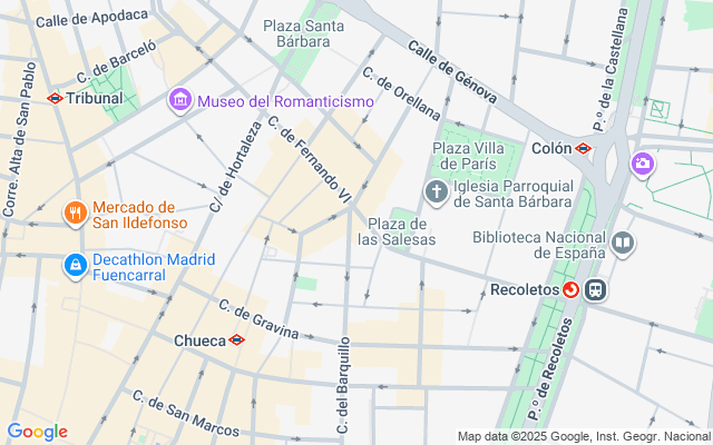 El piso se encuentra en una ubicación privilegiada, cerca de la Plaza de las Salesas y de la calle General Castaños, dos de las zonas más emblemáticas y exclusivas de Justicia. Además, en un radio de 10 kilómetros se encuentran varios colegios de renombre, como el Colegio San Patricio y el Colegio Santa María del Pilar.