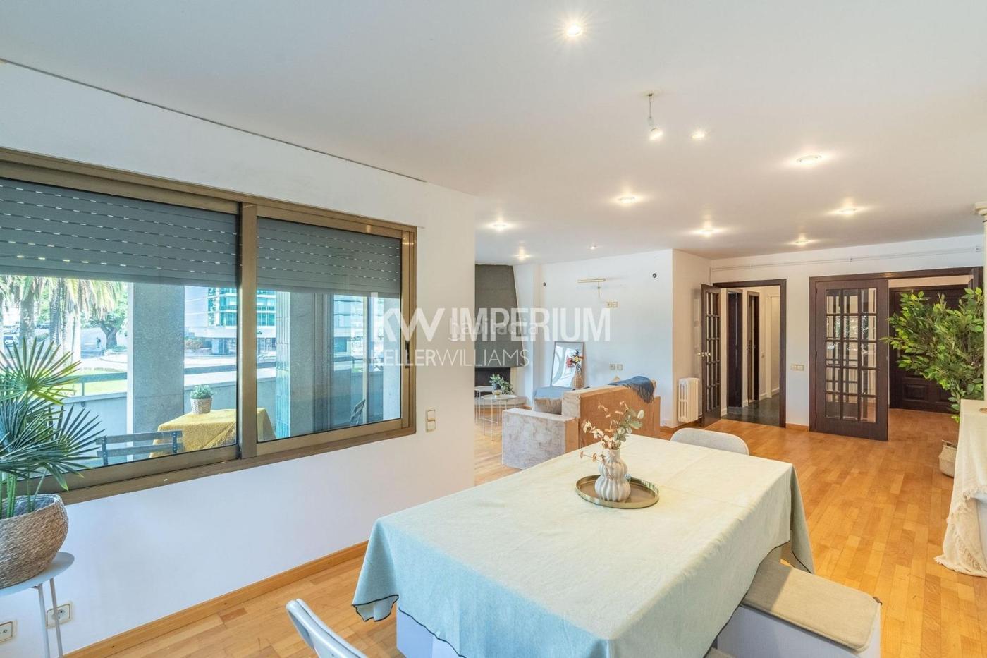 Visitamos esta propiedad atravesando generosos halls de entrada al edificio según se acceda por la Rambla President Companys o bien por la Avenida Vidal y Barraquer. Una vez situados en la entrada de la vivienda, con su puerta principal y otra de servicio independiente, atravesamos un amplio recibidor y descubrimos un gran y luminoso comedor-sala de estar con chimenea y grandes cristaleras que comunican, mediante dos correderas a ambos lados, a una bonita terraza-balcón en esquina y con vistas despejadas a la plaza de la Generalitat.