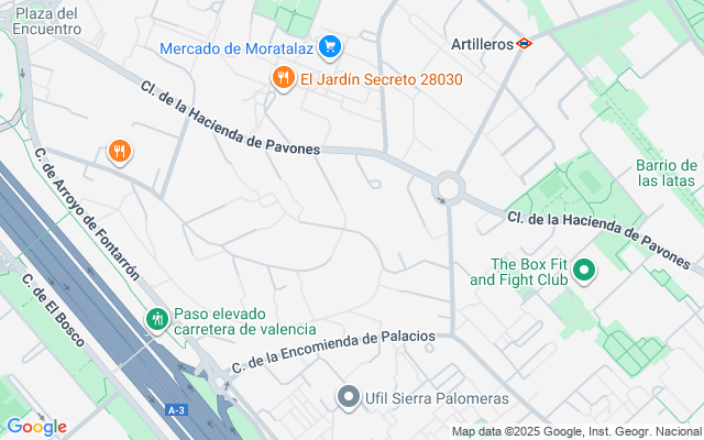 La vivienda esta ubicada en a cinco minutos de la zona comercial de Moratalaz y a la plaza del Encuentro (la zona comercial). Tiene todos los servicios, como supermercados 'Carrefour24', bancos, tiendas, colegios, biblioteca, parques y jardines. A 7 minutos del metro artilleros linea 9 de metro y a un minuto a las líneas de autobuses 0, N8,