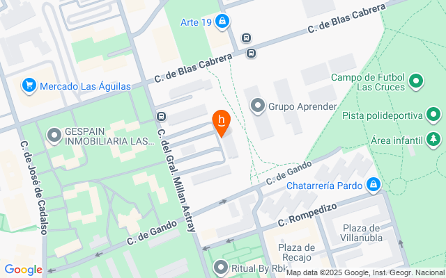 Situada a dos minutos del acceso a la M40, a cinco minutos del centro comercial Isla Azul. Igualmente se encuentra muy cerca del Mercado de Las Águilas y área comercial de Cuatro Vientos en la intersección de la avenida de la Aviación y la calle Rafael Finat.