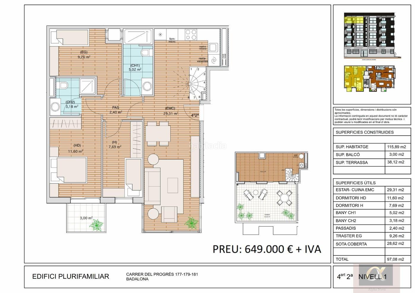 - Ático 2ª dúplex de 111,89m2 de 4 habitaciones y 2 baños y con una preciosa terraza de 31m2 por 649.000 euros + IVA