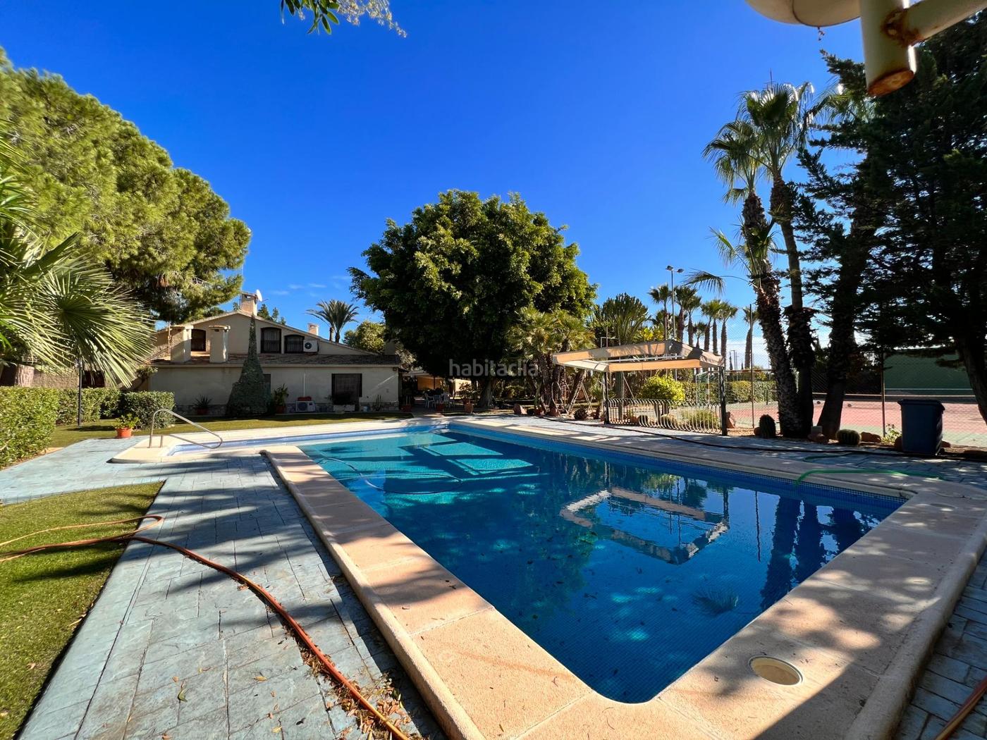 Amplio chalet en Maitino muy cerca de Elche y a tan solo 15 minutos de la playa, rodeado de un precioso jardín con palmeras y zonas verdes. La propiedad consta de una parcela de 5.000m2 con 804 metros construidos distribuidos en la casa vestuarios y barbacoa independiente. La casa dispone de 3 habitaciones amplias y 2 baños equipados, buhardilla con amplia salón-dormitorio con chimenea , salón-cocina tipo office , despensa . Porche acristalado Piscina privada y pista de tenis con vestuarios. Totalmente equipado y amueblado.