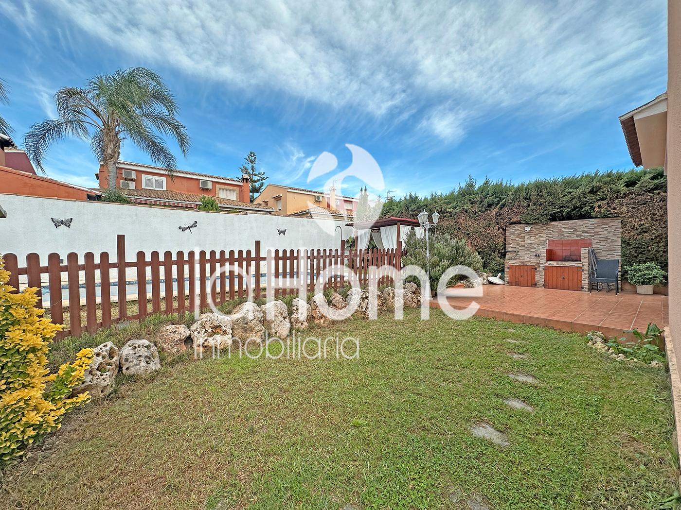 El exterior cuenta con un jardín con césped natural, una piscina privada que invita a disfrutar de los días soleados, un paellero ideal para las celebraciones familiares y un porche cubierto que aporta funcionalidad y encanto. Un entorno perfecto para vivir el exterior durante todo el año.