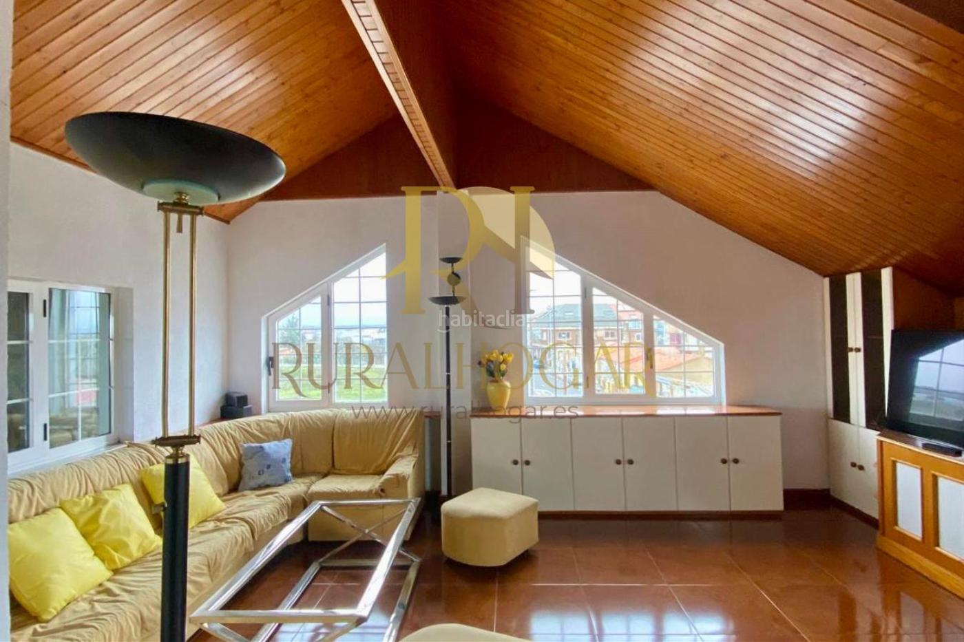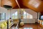 Amplio salón con techos abuhardillados y forrados de madera.