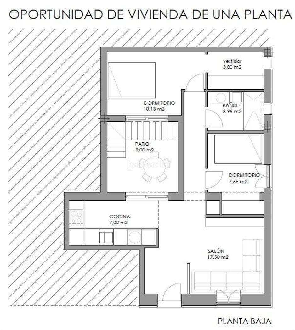 Se vende vivienda de una planta que hace esquina con 75 m2 de superficie.