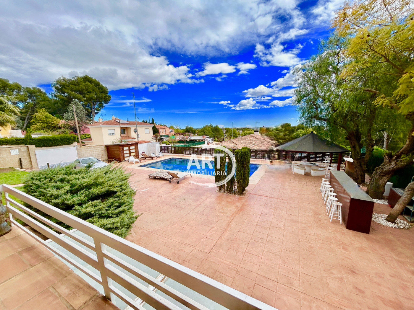 En el exterior hay un bonito jardín con riego por aspersión ya consolidado con una gran piscina con escalera romana tiene junto a ella un bonito cenador y una barra de bar con expendedor de cerveza.