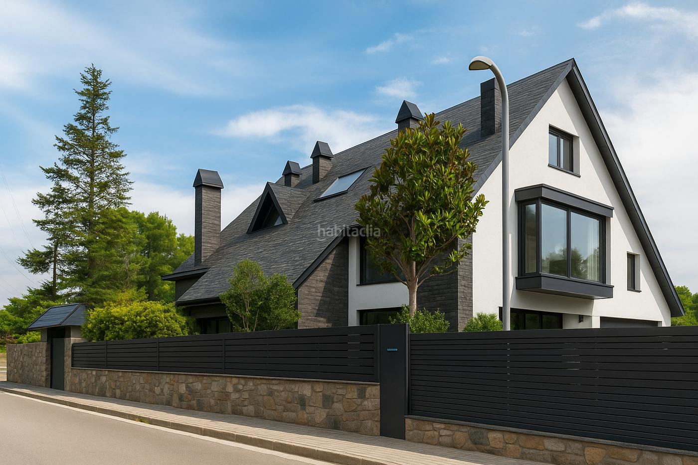 Un bonito jardín rodea la casa y en la fachada sur encontramos una gran piscina con convenientes zonas de sombra.