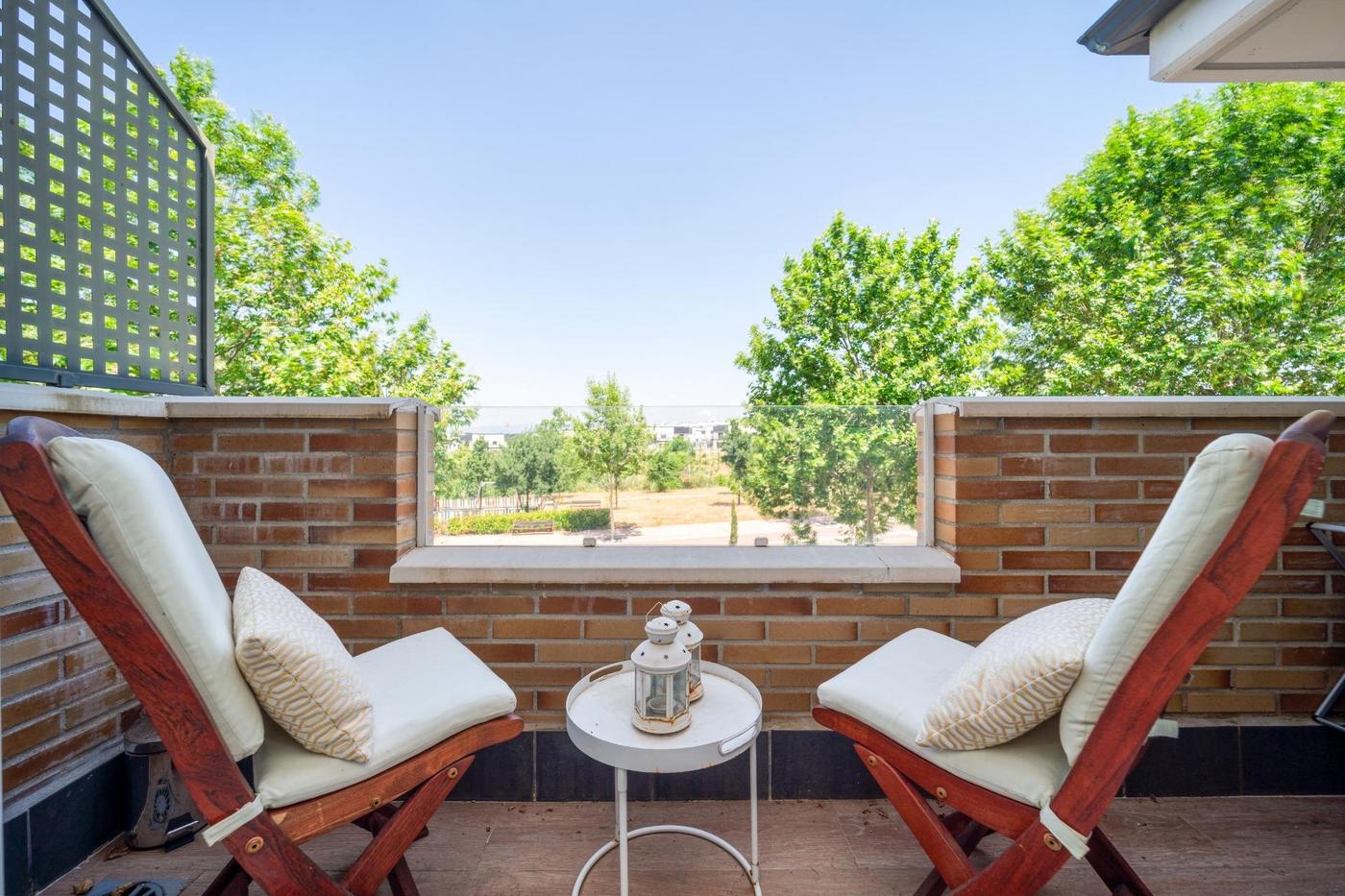 El jardín trasero tiene acceso directo a las zonas comunes de la urbanización, que cuenta únicamente con 19 viviendas, lo que asegura un ambiente tranquilo y exclusivo.