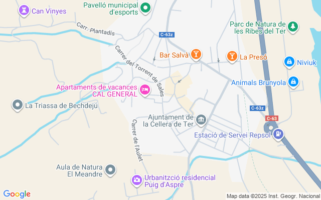 La Cellera de Ter tiene una extensión de 14,63 km², con una parte montañosa y una llanura fértil alrededor del río Ter y la riera de Osor. El casco antiguo del pueblo está situado en el centro del valle, a los pies de la montaña de Puigdefrou