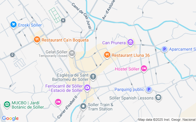 Sóller es una localidad de belleza sublime en plena Sierra de Tramuntana, conocida por su microclima donde se cultivan las naranjas y limones más apreciados de la isla. Es famoso también por su pintoresco tren y y el tranvía que lleva a visitantes al Puerto de Sóller, hermosísimo enclave natural en forma de herradura.