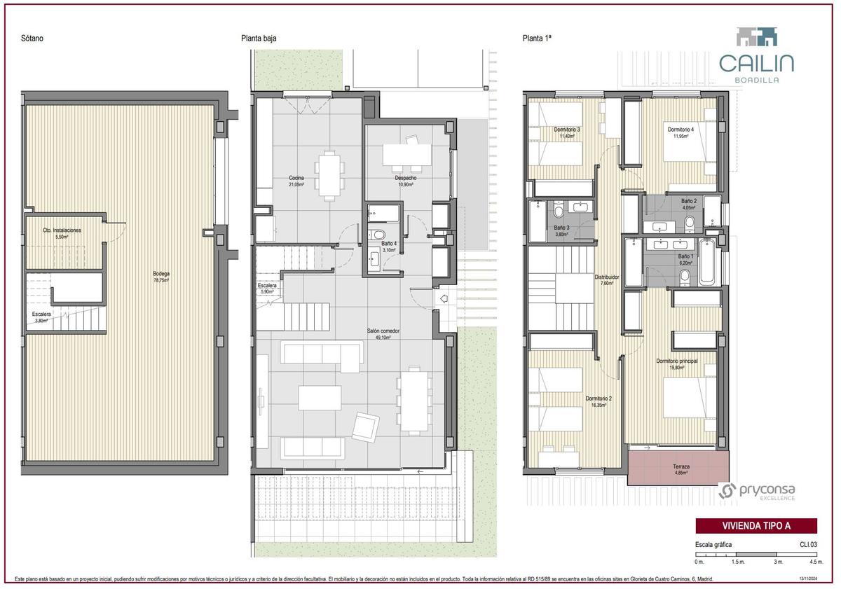 Proponemos 3 tipos de vivienda, con diversas distribuciones y superficies en torno a los 315 m² construidos y distribuidos en planta baja, primera, bajo cubierta y sótano.