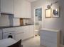 Baño completo con plato de ducha y mampara. Cocina amueblada con electrodomésticos (nevera bajo encimera, lavaplatos, lavadora, microondas, vitrocerámica y campana extractora).
