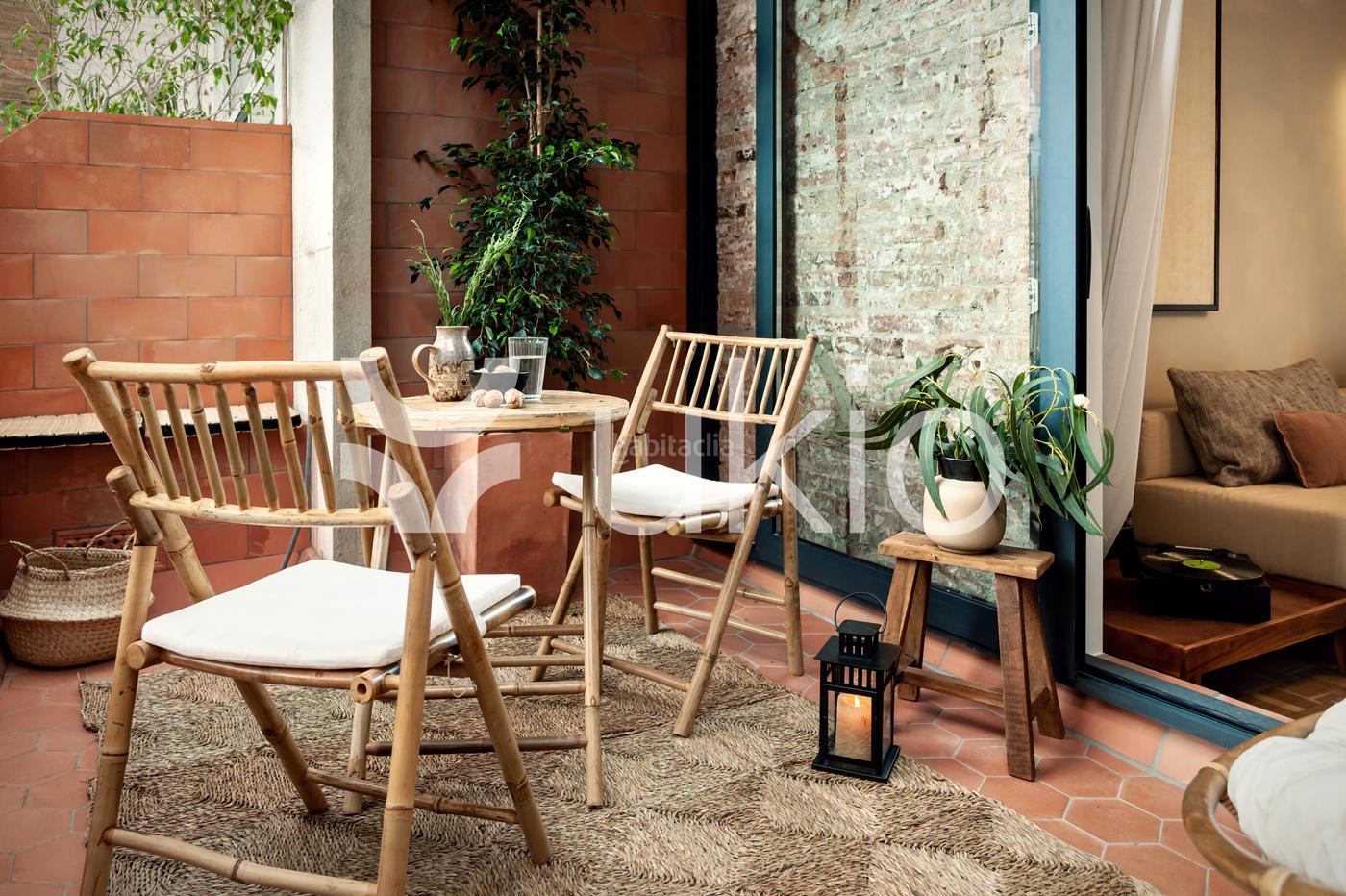 La sala de estar incorpora vibrantes plantas, las cuales, contrastando con los tonos claros, logran aportar mayor iluminación al espacio. La terraza exterior incluye una acogedora tumbona y la pequeña zona de comedor, que disfruta de absoluta privacidad gracias al panelado de bambú.