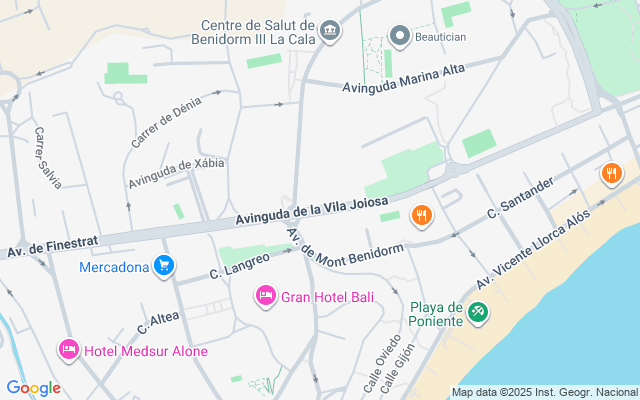 Se encuentra a 400 m de la playa de arena "Playa de Poniente", 600 m del supermercado "Mercadona", 300 m de la estación de autobuses, 300 m del restaurante, 2 km de la playa de roca "Playa La Cala de Finestrat", 2 km de la ciudad "Casco Antiguo / Old Town", 3 km del campo de Golf "Las Rejas Golf", 5 km de la pista de esquí "Cable ski acuático", 45 km de la estación de tren "Renfe Terminal de Alicante", 55 km del aeropuerto "El Altet Alicante" y está ubicado en una zona con encanto y junto al mar.