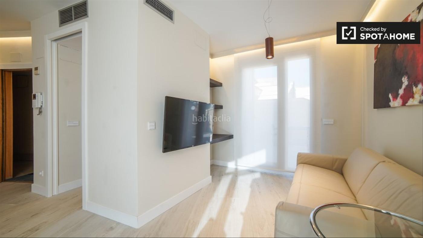 Este elegante estudio se alquila en la zona de Argüelles de Madrid. Hay una hermosa terraza privada fuera del apartamento con asientos románticos para dos. También puede obtener vistas impresionantes de la ciudad desde aquí. Los tonos sutiles decoran la sala de estar, y las obras de arte abstractas en sus paredes. Esta habitación cuenta con una mesa de comedor de madera maciza para dos, un cómodo sofá y una gran TV de pantalla plana. La habitación es una habitación doble cómoda y, de nuevo, presenta una decoración moderna y elegante.