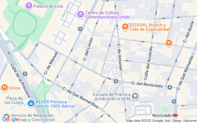 Situado en el corazón del Barrio de Malasaña, podemos encontrar en sus alrededores numerosas tiendas, bares, restaurantes, zonas de ocio, paradas de Metro como Noviciado o Plaza de España o autobús como la línea 002 Argüelles, con lo que se localiza en un lugar perfectamente comunicado. Además el Museo ABC, el Centro Cultural Conde Duque o la Hemeroteca Municipal de Madrid, se encuentran a escasos 5 minutos andando de la vivienda.