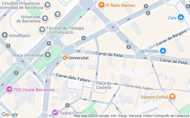 Transporte público: parada de metro Universitat (L1, L2), Catalunya (L1, L3, L6). Amplia red de autobuses en la zona.