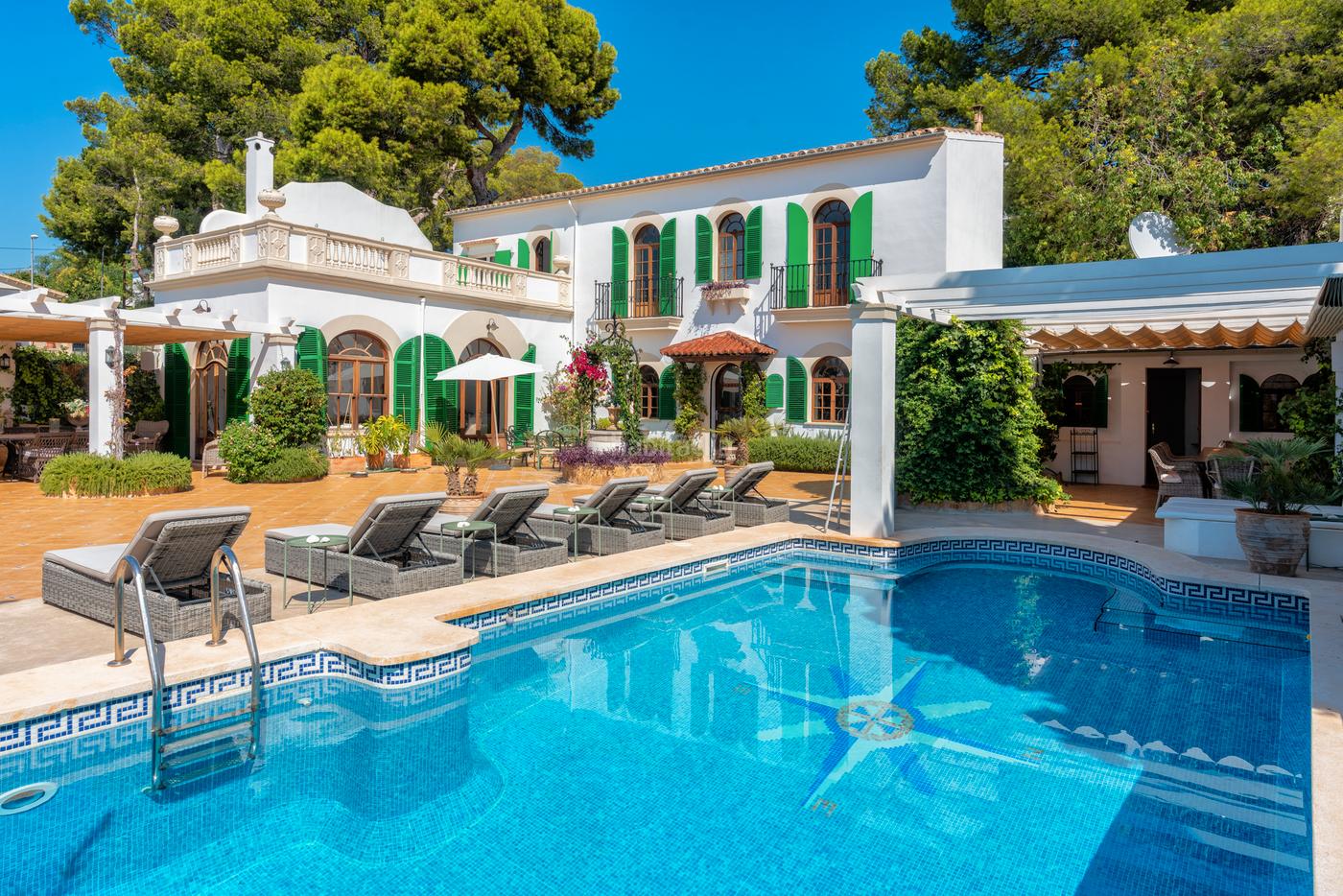 La casa está situada en una tranquila zona residencial de Marivent, a pocos minutos de la playa y del Palacio de Marivent, residencia de verano de la familia real española. Una característica muy importante de la propiedad es el hermoso jardín maduro con impresionantes palmeras, pinos mediterráneos y una amplia selección de flores y arbustos subtropicales. La piscina elevada con sus amplias terrazas se convierte en el punto central para el entretenimiento con la familia y amigos.