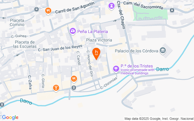 Se encuentra ubicada en el Paseo de los tristes, un lugar con mucha historia donde puedes pasear y disfrutar de su entorno….., de las vistas a la Alhambra y a Sierra Nevada….
