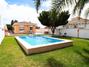 La parcela bien cuidada, con 500 m2 aprox, dispone de una entrada para vehículos y otra peatonal, con plaza para un vehículo, una gran zona ajardinada y una amplia piscina con zona de barbacoa.