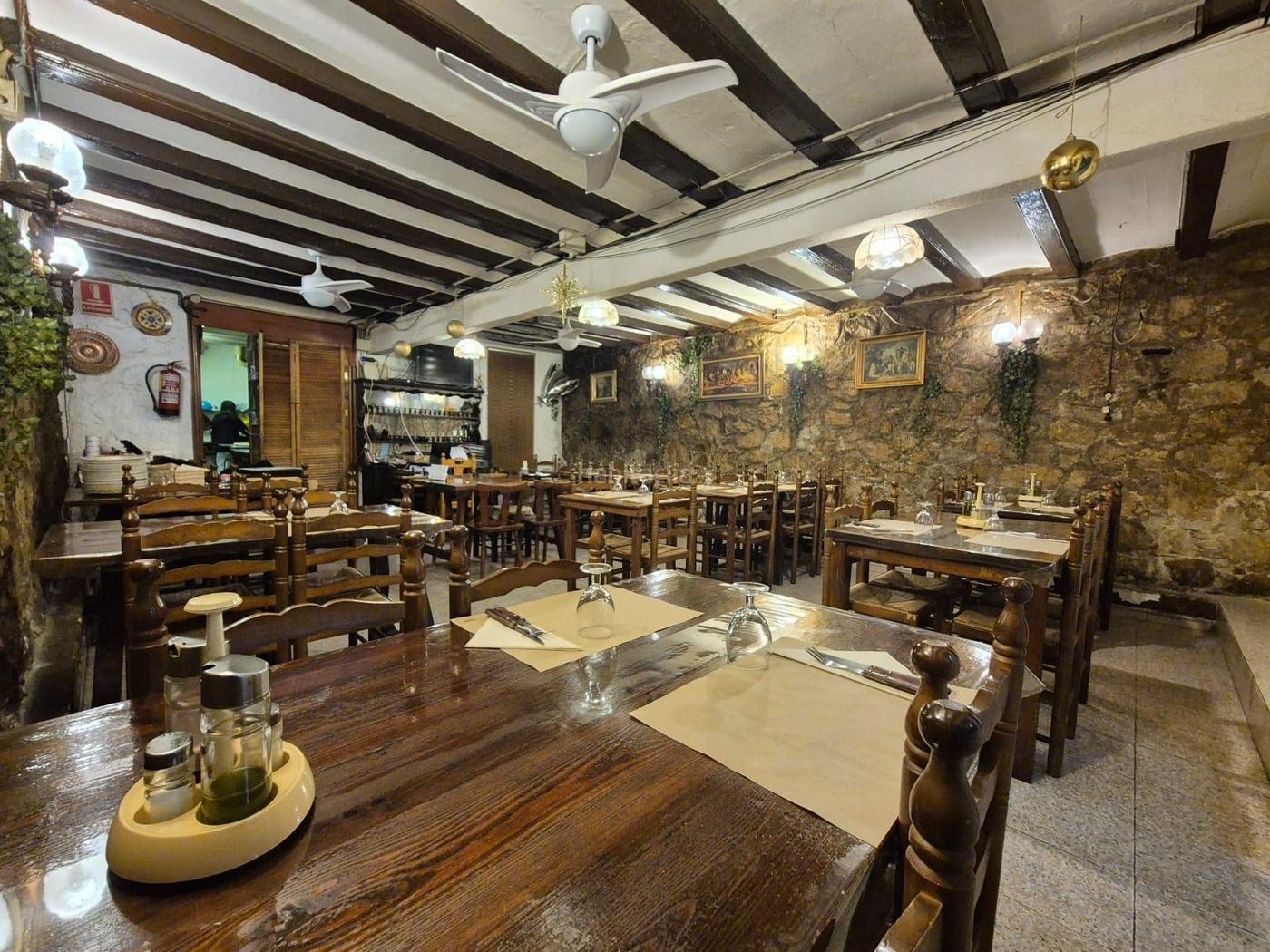 El local tiene una imagen muy característica, con paredes de piedra, vigas de madera y mobiliario clásico, lo que genera un ambiente cálido y diferenciador, perfecto para cocina tradicional o de autor. La sala permite una buena capacidad de mesas, ideal para trabajar menús de mediodía, carta y grupos.